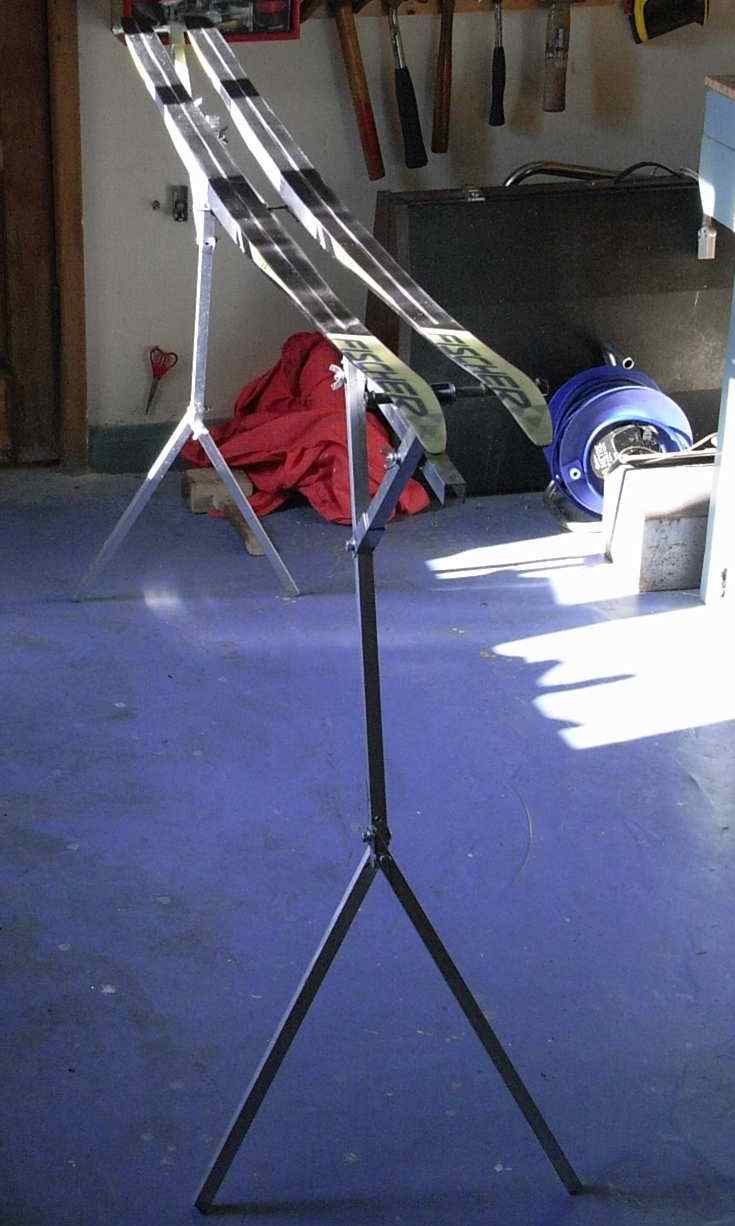The skis tips and tails rest on ski support bars which drop onto the tops of the top legs. When the ski bindings are clipped onto the Binding Bar, the spring of the ski adds to the bench rigidity. For best performance, both skis should be fitted, one on either side of the channel.