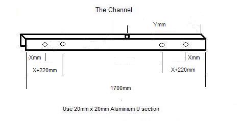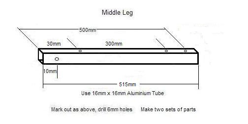 The distance between the holes for the Top Legs is L-400mm so provided you are using the same channel length as me (1700), drill 6mm holes in the sides of the channel at X=(1700-L+400)/2 mm from each end of the channel. Drill 6mm holes for the Middle Legs a further 220mm nearer the centre.